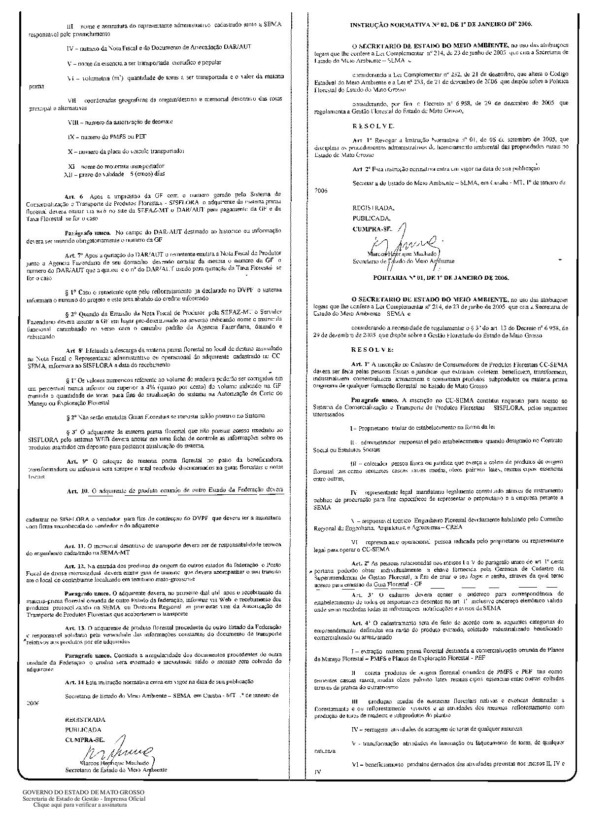 | PORTARIA Nº 01, DE 1º DE JANEIRO DE 2006 (REVOGADO) | Dispõe que a inscrição no Cadastro de Consumidores de Produtos Florestais CC-SEMA deverá ser feita pelas pessoas físicas e jurídicas que extraiam, coletem, beneficiem, transformem, industrializem, comercializem, armazenem e consumam produtos, subprodutos ou matéria prima originária de qualquer formação florestal, no Estado de Mato Grosso. |