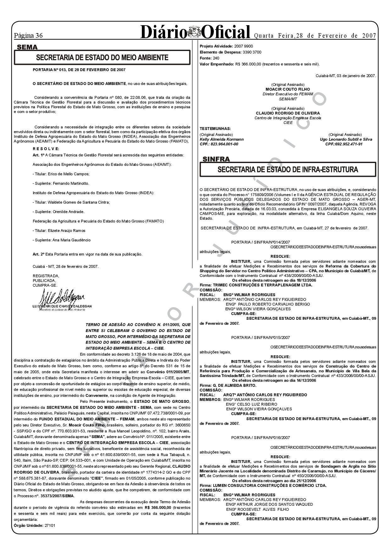 | PORTARIA Nº 166, DE 27 DE DEZEMBRO DE 2006 | Transfere ao Município de Cuiabá a competência para licenciar os empreendimentos e atividades urbanas de pequeno e/ou médio níveis de poluição e degradação ambiental. |