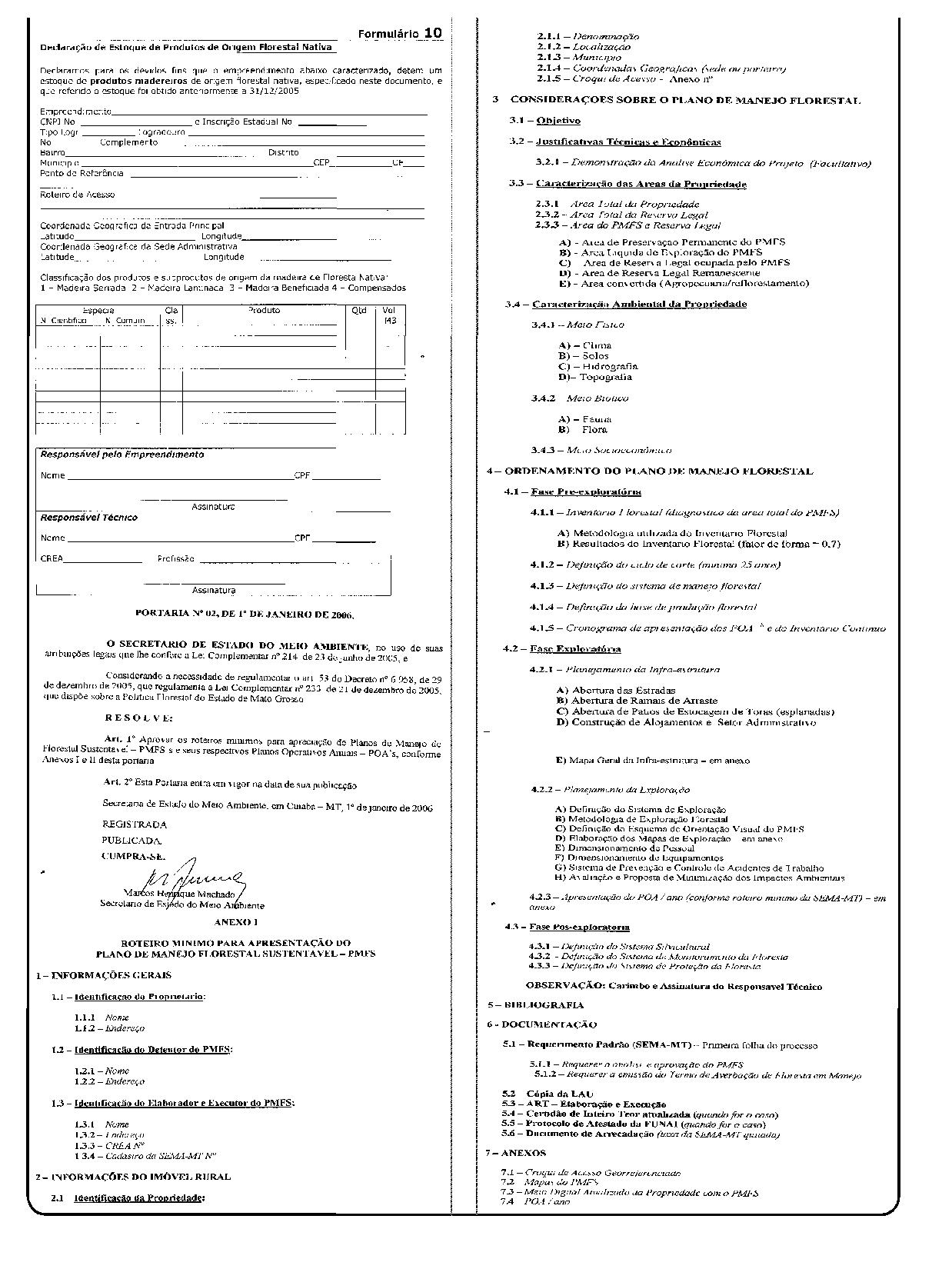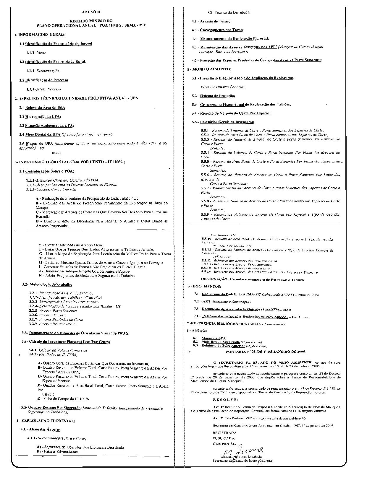 | PORTARIA Nº 02, DE 01 DE JANEIRO DE 2006 | Aprovar os roteiros mínimos para apreciação de Planos de Manejo de Florestal Sustentável – PMFS’s e seus respectivos Planos Operativos Anuais – POA’s, conforme Anexos I e II desta portaria. |